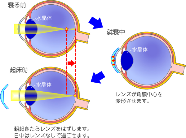 - 夜、寝る時に専用のレンズを着けて眠ることで視力を矯正し、日中は裸眼で過ごすことができる視力矯正方法です。
